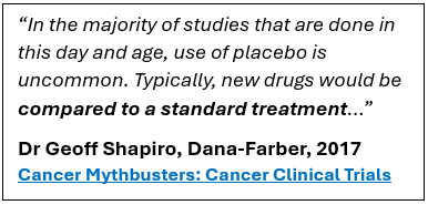 So make sure you ask your physician and nurse if there is a placebo alone group in the clinical trial you are considering. The answer is likely ‘no’.